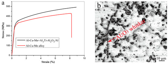Figure 6a illustrates the stress–strain behavior of Al-Cu-Mn alloy and Al-Cu-Mn alloy treated with the Al3Ti-Al2O3/Al inoculant. The enhancement of the ultimate tensile strength and a slight increase in elongation were evidently observed in the alloy. The Al-Cu-Mn alloy exhibited an initial tensile strength of 428 MPa and an elongation of 8.2%. Upon inoculation with the Al3Ti-Al2O3/Al inoculant, the ultimate tensile strength was enhanced to 492 MPa, while the elongation increased to 8.8%. According to Figure 3, the addition of Al3Ti-Al2O3/Al inoculants resulted in a significant reduction in the average grain size of Al-Cu-Mn alloy, leading to an increase in grain boundaries. During plastic deformation of the alloy, the presence of grain boundaries impeded dislocation movement, thereby increasing the tensile strength of the alloy. In addition, the Al3Ti and Al2O3 particles can also act as the obstacles to the dislocation motion, thus leading to higher tensile strength. The alloy could maintain good plasticity while the tensile strength was increased, on the one hand because the grain refinement made the applied stress more evenly dispersed in each grain and, thus, not making it easy to form stress concentration. On the other hand, unreacted Al2O3 whiskers can serve as a bridging agent in the matrix (as illustrated in Figure 6b), thereby contributing positively to the plasticity of the alloy.