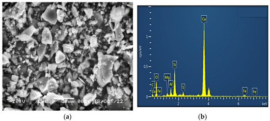 Scanning electron microscopy (a) and energy spectrum analysis (b) of cement under study.