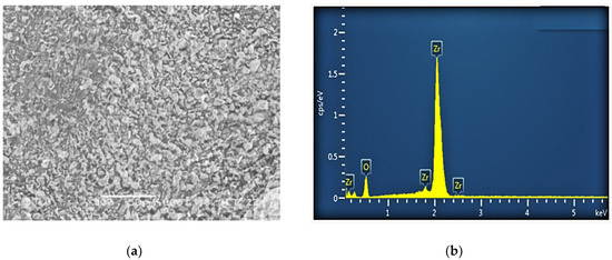 The nanopowder used in this study was produced by Zhongte Materials Co., Ltd (Anshan, Liaoning, China). Shares of its main components (zirconia, SiO2, Fe2O3, and TiO2) are summarized in Table 3. The SEM image and EDS diagram (with elemental analysis) are shown in Figure 2. Zirconia is chemically very stable and has good thermo-chemical stability and high temperature conductivity. Zirconia has high strength and toughness, and strong mechanical properties. At the same time, zirconium oxide can be used as a separate modification material, due to the small size of zirconium oxide nanopowder particles, so that its specific surface area is greatly increased, and greatly improving the modification effect.