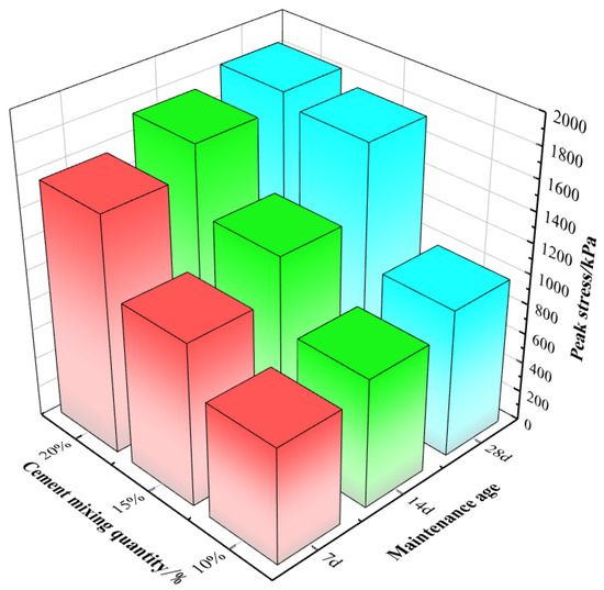 The average values of their peak stresses are presented in Figure 4. The strength of the cement-modified silty soil slowly increased with the curing age while keeping the cement mixture constant at 10%, and increased by 12% and 10%, respectively; the strength of the cement-modified silty soil sharply increased with the curing age while keeping the cement mixture constant at 15%, and increased by 12% and 13%, respectively; the strength of the cement-modified silty soil continued to increase slowly with the curing age while keeping the cement mixture constant at 20%, and the strength of the cement-modified silty soil continued to increase with the curing age, and increased by 11 and 10%, respectively. The strength of cement-modified silty soil continued to grow gradually with curing age and increased by 11% and 10%, respectively. This was because a 10% cement content was insufficient to react fully, and that of 20% was excessive for rapid reaction.