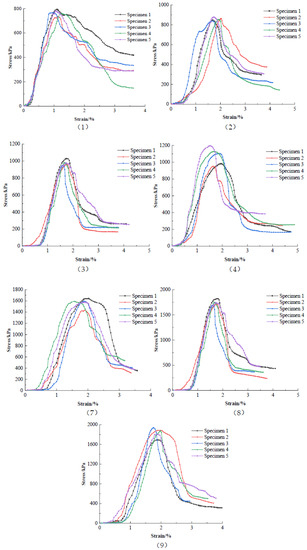 To investigate the strength of the silty soil in Haikou Bay with different cement and nanopowder contents and curing ages, the water content was kept constant at 50%, and the cement admixture was 10%, 15%, and 20%; the curing ages were 7 d, 14 d, and 28 d. Five specimens were made for each test and referred to as specimens 1 to 5, respectively. The orthogonal tests were performed according to the orthogonal design shown in Table 6, and the stress–strain curves of the unconfined compressive tests are shown in Figure 5.