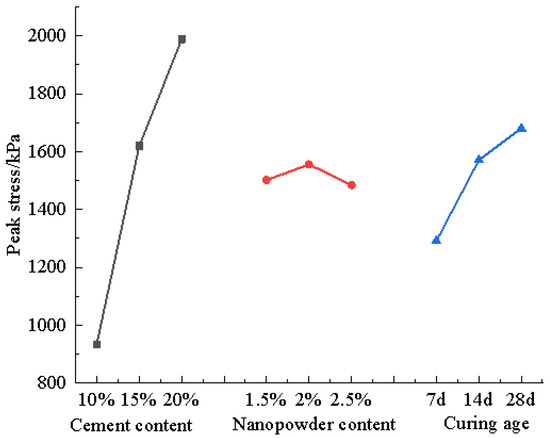 According to the test results, the cement content, nanopowder content, and curing age were taken as influencing factors, and the peak stress of the test data was taken as the observed value. The orthogonal test extreme difference analysis table is presented in Table 7.