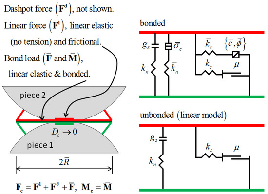 In the parallel bonding model, the contact force can be decomposed into a linear component, a bonding component, and a parallel bonding force, as follows [30]: