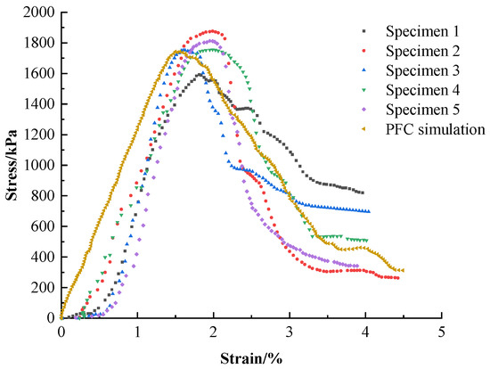 At the peak stress stage, the peak stress of the PFC simulation curve and five experimental curves coincided (2200 kPa), and the strains corresponding to the peak stress were all 1.9%. The PFC simulation and experimental data had a high agreement in terms of peak stress and peak strain, indicating that the simulation results in this stage were more satisfactory.