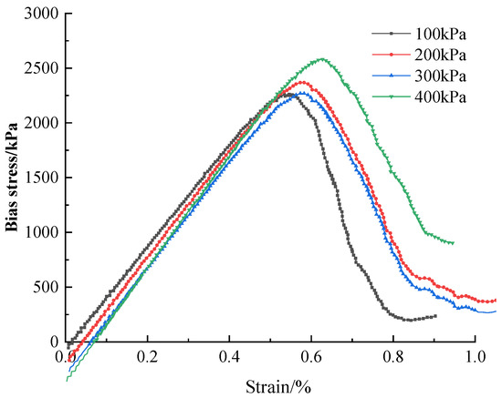 Simulation of the triaxial and unconfined compressive tests were also performed with the parameter of perimeter pressure. According to the values of the fine parameters set in the above simulation, the prediction was made by substituting unconsolidated undrained conditions into the triaxial compression model. The maximum principal stresses were obtained through partial stresses for damage at different surrounding pressures (100, 200, 300, and 400 kPa). The partial stress–strain curves were plotted in Figure 10.