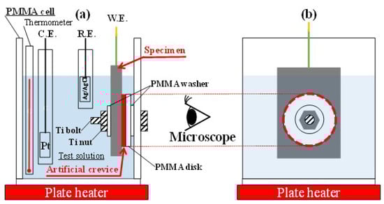 The artificial crevice-forming PMMA disk (ø20 mm) and PMMA washer (ø12 mm) were inserted between the test piece and the PMMA electrolytic cell wall, with in situ observations carried out through the outside sidewall of this PMMA cell set-up.
