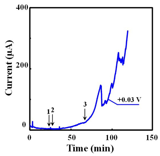 The change of anodic current over test time (Black arrows and numbers indicate initiation of each corrosion site) (UNS S32205, 0.6 M NaCl, 50 ± 1 °C, +0.03 V vs. Ag/AgCl).