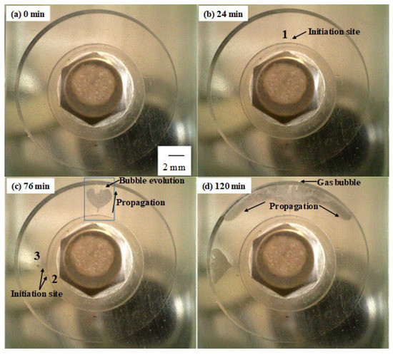 After the crevice reached the crevice mouth, corrosion further propagated circumferentially along the edge of the crevice, growing in size, as shown in Figure 4d. Such results were observed under all test conditions. The crevice gap is very tight at the edge of the washer because of the contact pressure by the Ti bolt, with the crevice gap increasing gradually as it approaches the crevice mouth due to the PMMA disk being slightly warped towards the crevice mouth [24]. The in situ observation suggested that it was not difficult for crevice corrosion to initiate at the site of a tight crevice gap and propagate to grow toward the mouth, where the gap is looser. It is possible that the crevice gap may influence the crevice corrosion behavior if the crevice gap varies with the surface finish or surface morphology of the specimen.