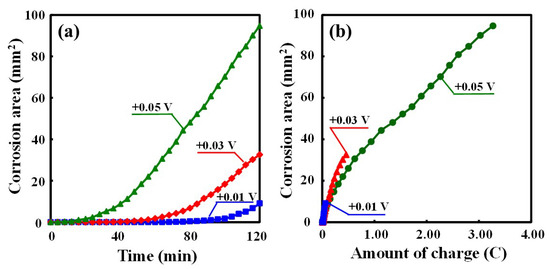 Under higher applied potentials, crevice corrosion initiated earlier, with an increase in corrosion area over time. The time to initiate corrosion from the start of the test was 68 min, 24 min, and 8 min for an applied potential of +0.01 V, +0.03 V, and +0.05 V, respectively. Even at the highest potential of +0.05 V in the test conditions, the corroded area continued to increase with time until the end of the test. The overall corroded area at the end of the test was up to a corroded area of 95 mm2 in size, out of a maximum area under the crevice former of approximately 200 mm2. A correlation of the measured charge with the corroded area over exposure time for all three different potentio-static test conditions is shown in Figure 6b. In the +0.05 V test, the total amount of charge was, as expected, the highest, with the measured charge scaling with the applied potential.