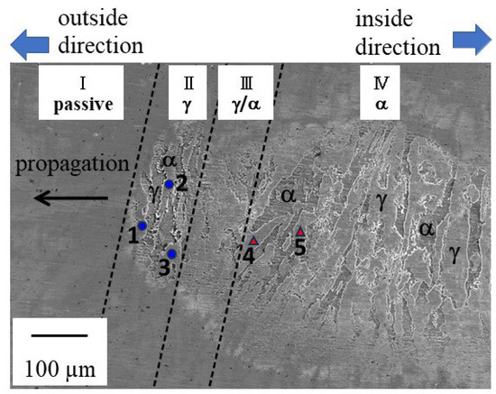 SEM photograph of corroded area inside crevice after the test (I) passive zone, (II) preferential dissolution zone of γ phase, (III) γ phase and α phase dissolution zone, (IV) preferential dissolution zone of α phase (⬤, ▲: EDX analysis point) (UNS S32205, 0.6 M NaCl, 50 ± 1 °C, +0.03 V vs. Ag/AgCl).