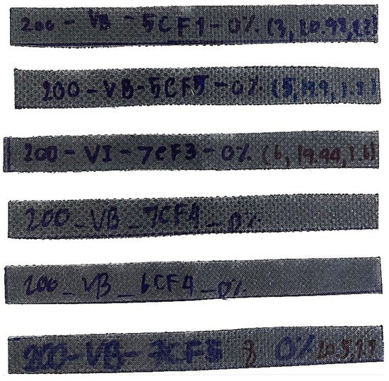 During the specimen preparation process, the resin and graphite filler are meticulously blended at varying ratios of 5 wt%, 7.5 wt%, 10 wt%, 12.5 wt%, and without any graphite filler to create the matrix. After reaching the desired ratios, a hardener is introduced into the mixture, enabling the manufacturing process of the carbon fiber/epoxy composite. Subsequently, the carbon fiber fabric is integrated with the resin–filler mixture to form the composite material. The specific manufacturing conditions for the carbon fiber/epoxy composite are detailed in Table 1. The manufacturing scope, as outlined in Table 1, consists of 103 specimens comprising 8 layers of fabric, which were adopted from the study by Phunpeng V. et al. [20]. The remaining 384 specimens were newly manufactured for this research. Figure 1 depicts an example of a specimen with eight layers of carbon fabric and graphite filler in a [0°/90°]4s configuration. In Figure 2, a completed manufacturing sample is illustrated, showcasing various boundaries. For instance, the specimen labeled as “200_VB_5CF1_0%” in Figure 2 refers to the use of carbon fabric with a weight of 200 g/m2, produced through a Vacuum Bagging (VB) process. It comprises five layers of carbon cloth arranged in a [0°/90°/0°/90°/0°] configuration, with no graphite filler (0% content). The numbers 3, 20.98, and 1.2 correspond to the quantity of specimens, width, and thickness, respectively.