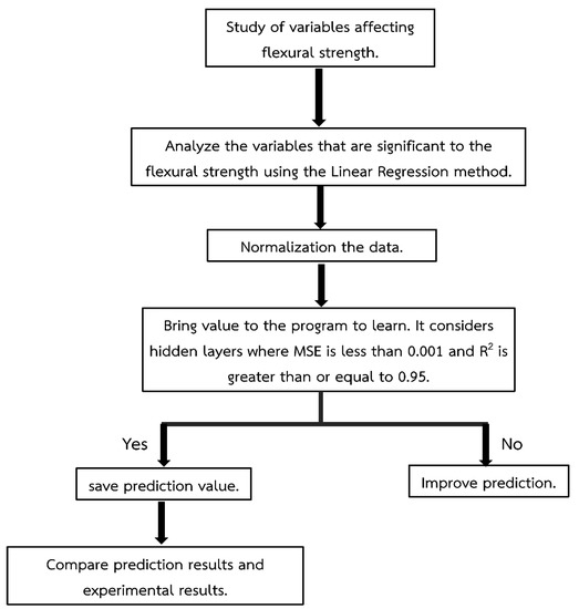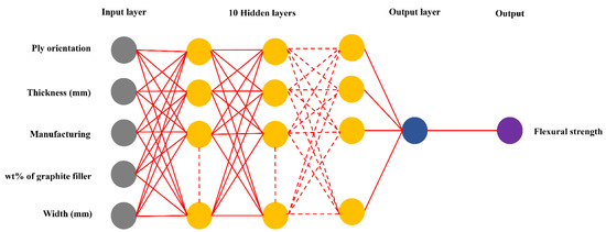 To determine the flexural strength when changing ply orientation and number of layers, multiple specimens must be tested for reliable results. However, this can lead to long production and testing times. Therefore, methods have been developed to reduce the time and materials required to form test specimens by predicting the flexural strength of materials. Nowadays, various innovative methods (such as artificial intelligence (AI), fuzzy) can be used to predict the interested things [25,26]. Artificial intelligence (AI) is a science of technology that has developed computer systems to perceive the process of thinking, acting, reasoning, adaptation, inference, and functioning of the human brain. AI is used in many lines (i.e., industry, surveying, and research) [27,28,29]. There are various methods for processing AI to accurately predict values of interest, and the most popular and suitable method for numerical analytics is the artificial neural network (ANN) [30].