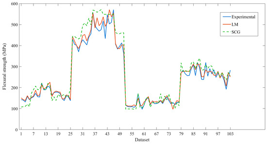 Using the algorithms of LMBP and SCG, the flexural strength values of both algorithms were compared with the experimental values, as shown in Figure 4. It is found that both algorithms can predict the flexural strength close to the experimental values. To be able to indicate which of the two algorithms can predict flexural strength closer to the results of the experiment, the MSE and R2 of the testing data are considered, as shown in Table 6. Prediction using the LM algorithm can predict the flexural strength more accurately than the SCG algorithm. The MSE value of the LM algorithm from the testing data was 0.0044, which was less than the prediction by the SCG algorithm, which was 0.00838, indicating that the LM algorithm’s flexural strength prediction error value demonstrated less prediction error than the SCG algorithm. The R2 value from testing with the LM algorithm was 0.9926, which was closer to 1 than the prediction from the SCG algorithm, with an R2 of 0.9791, indicating that the LM algorithm was more suitable for predicting the flexural strength than the SCG algorithm.
