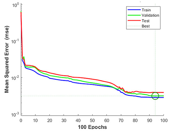 The convergence of data, taking into account the error or MSE values, can be observed in Figure 6, considering the 5-10-1-1 prediction structure. The data initially started with higher error values and gradually adjusted to reduce the errors, resulting in more accurate predictions. As depicted in the figure, all three sets of data (training, validation, and testing) converge towards the line representing the lowest error reduction at epoch 94. This indicates that the model achieved optimal performance in terms of minimizing errors and producing reliable predictions.