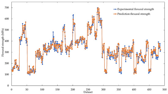 In order to predict the flexural strength, the data to be predicted must be normalized to the available data to obtain a boundary value between −1 and 1, according to the boundary of the normalized flexural strength. To obtain the predicted value by the flexural strength prediction results of the data in Table 7, the prediction is shown in Table 9.