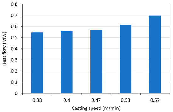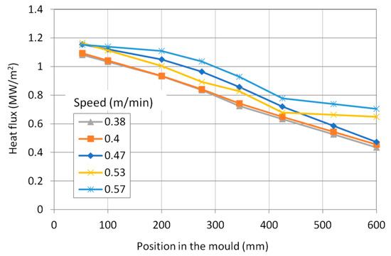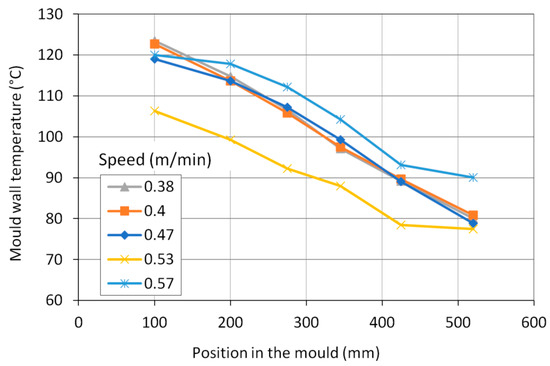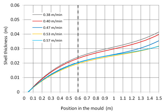 The shell thickness calculated by the numerical model for the selected casting speeds is shown in Figure 5. Although the article focuses on the mould, an even greater length of the blank than the mould length was calculated. A thermal boundary condition below the mould was obtained by laboratory measurement of the heat transfer coefficient under cooling nozzles.