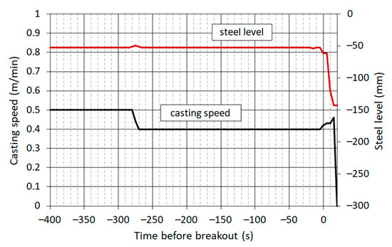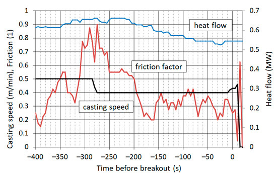 Operating data have been recorded with a period of 5 s. Figure 6 shows a record of the casting speed, friction in the mould and the heat flow to the cooling water. On the horizontal axis is time relative to the moment of breakout. The casting speed was constant at 0.50 m∙min−1 for about 22 min before the breakout. In the time 280 s before the breakout, the prediction system indicated the danger of breakout based on the high value of friction in the mould. The caster control system responded by reducing the casting speed to 0.40 m∙min−1.