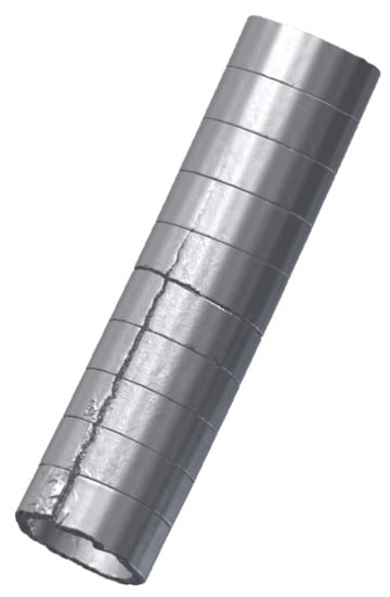 All parts of the shell were successively scanned and completed lengthwise (Figure 10). It can be seen from the figure that the crack originated in the mould on the side of the inner radius about 0.4 m from the steel surface and continued along the length of the block.