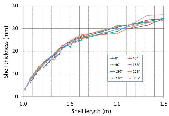 Figure 13 shows the longitudinal profiles of the shell thickness at angular coordinates with a step of 45°.