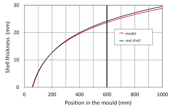 The result of one such comparison is shown in Figure 14. At the end of the mould, the average thickness of the real shell was 24.8 mm, while the model calculated a thickness of 23.7 mm. The average relative error of the model along the mould length was less than ±2.5%.