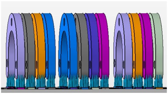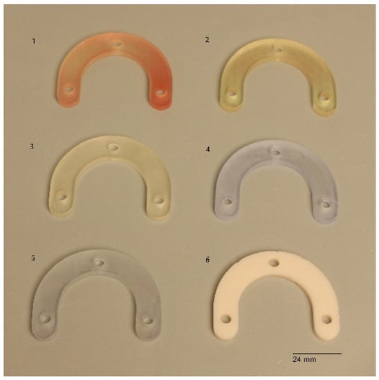 The test model was digitally scanned using a 3D scanner (D900 3D scanner; 3Shape, Copenhagen, Denmark: 4 cameras at 5.0-megapixel resolution, blue LED light technology and a documented scan accuracy of 7 microns for crown and bridge and of 8 microns for implant bars). A surgical guide with a thickness of 5 mm and a convergence of 2.5° for the replicas’ space holes was designed using the CAD/CAM software (3Shape DentalDesigner Premium 2013, 3Shape) and saved as an STL file (Figure 2). The design was exported as an STL file and was 3D-printed using 5 different 3D-printing materials (S: Sheraprint-SG; Shera Werkstoff-Technologie GmbH & Co. KG, Lemförde, Germany; N: NextDent SG; 3D Systems GmbH, Moerfelden-Walldorf, Germany; V: V-Print SG; Voco, Cuxhaven, Germany; O: Optiprint guide 385; Dentona AG, Dortmund, Germany; and L: LuxaPrint Ortho; DMG Chemisch-Pharmazeutische Fabrik GmbH, Hamburg, Germany). Eight specimens were printed for each group of material. The vertical digital arrangement of the surgical guides before printing can be seen in Figure 3. The 3D-printing was conducted according to the recommendations of the manufacturer and with the recommended 3D printer through digital light processing (DLP). An additional group, which was used as a control group for comparison purposes, was made from self-curing composite material (C: Luxatemp Fluorescence; DMG Chemisch-Pharmazeutische Fabrik GmbH). For this purpose, a duplicated silicone form was produced. The groups with their respective codes as well as the manufacturer and 3D printer are shown in Table 1. Specimens of the six tested materials are illustrated in Figure 4.