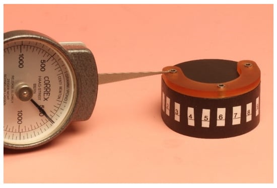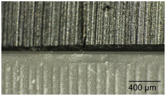 Each surgical guide was positioned onto a test model to prove that it fitted passively and accurately on the test model. For the measurements of the initial space between the guides and the test model, each surgical guide was fitted again onto the test model with a load of 500 g using the drag pointer of a measuring instrument (Correx; Haag-Streit, Bern, Switzerland). The load was applied at three specified points in front of the implants that were standardized for all guides (Figure 5). The resulting vertical discrepancy between the guide and the model at a load of 500 g was checked under an optical microscope with a 16× magnification (Wild M420; Heerbrugg, Switzerland) for all 11 standardized marked points, and a corresponding photo of the section was made (Figure 6). The measurements were conducted with photo editing software (Adobe Photoshop CC 19.1.6 release; Adobe Inc., San Jose, CA, USA). Each section was measured 10 times, and the resulting mean value was set as the vertical discrepancy for each mark between the guide and the model before sterilization at a load of 500 g (P1).