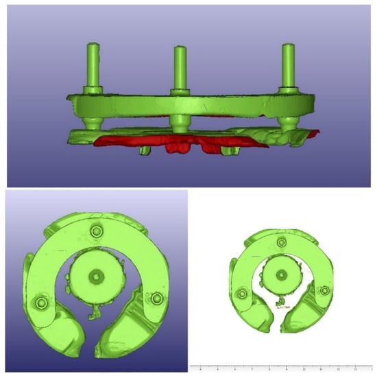 For the measurements of the angulation, three metal rods were connected to three external identical implant replicas and then inserted to the surgical guide. The surgical guides were then scanned (D900 3D scanner; 3Shape), and the resulting STL files were exported to a CAD/CAM analyzing and processing software (VisCAM View V5.2; Marcam Engineering, Bremen, Germany) to digitally measure the three angles between the metal rods for each specimen. Each angle was measured ten times, and then the mean value was calculated for each. Angulation scans and angulation measurements are illustrated in Figure 7.