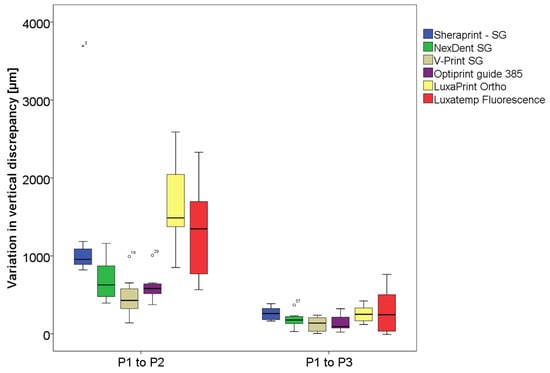 Diagram of the variation in measured vertical discrepancy before sterilization positioned with 500 g (P1) and after sterilization with 500 g (P2) and 1800 g (P3).