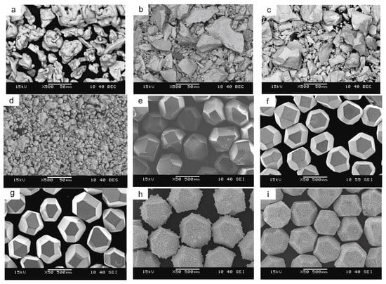 The starting powders: iron grade NC100.24 (a), low-carbon ferromanganese grade XH1218 (b), high-carbon ferromanganese grade XH1210 (c), tin-bronze grade NAM40-80/20 (d), uncoated diamond MBS (e), and metalized by: Ti (f), Si (g), Co (h) Cu (i).