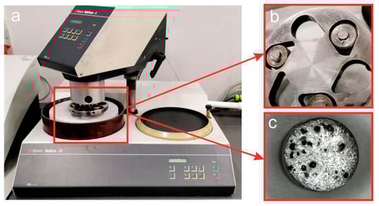 To test the retention properties of the matrix material, metal-diamond segments Ø11.3 mm× 5 mm were made of the 8 h ball-milled Fe-Mn-Cu-Sn-C powders as a matrix and synthetic uncoated and Ti, Si, Co, Cu metalized diamond grits of 30/40 mesh in size and at a concentration of 20 (5% vol.). Diamond-impregnated specimens were tested for wear rate on abrasive concrete using the same Struers equipment. The SiC paper was replaced with C8 grade very abrasive concrete. The test stand with the sample holder is shown in Figure 2. During each 20 s measuring cycle, the segments were individually pressed against the stone abrasive backing wheel with the force F = 20 N. The rotational speed of the backing wheel was 160 rpm. Under the set test conditions, the mean linear speed of the sample was 1.37 m/s.