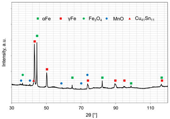 The X-ray diffraction analysis of the composites is presented in Figure 5. According to the Fe−Mn−C [26] phase diagram, it is possible to obtain homogeneous austenite under sintering conditions for the assumed parameters of the consolidation process. The complex carbides containing manganese and iron, present in the ball-milled powder, dissolve in austenite. Rapid cooling after holding at 900 °C hindered the carbides precipitation within the austenite grains. A small amount of carbides can occur at the grain boundaries, which was proven by the CTPi curves of Hadfield cast steel [26] having a similar chemical composition. However, in the case of the investigated material, the carried out diffraction analyses did not indicate any presence of carbides in the microstructure. Obtained data show that the microstructure of the as-consolidated material consists of the following phases: (γFe), (αFe), δ (Cu41Sn11), and oxides.
