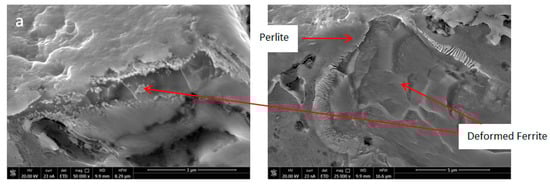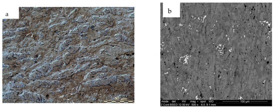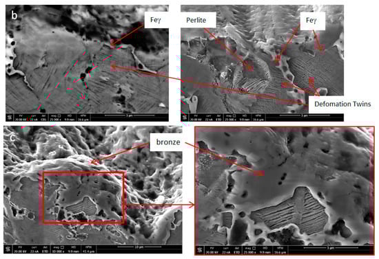 The LM and SEM analysis of Fe-Mn-Cu-Sn-C material after the consolidated process are presented in Figure 6. After wear tests, the SEM microstructure and the EBSD analysis results are presented in Figure 7 and Figure 8, respectively. As can be observed, as a result of wear, the ferrite regions were deformed (Figure 7a), and twining occurred in the places where the austenitic microstructure was present (Figure 7b). On the worn surface, it is clearly seen that bronze melts during hot pressing and fills all pores. It is also possible that bronze can be melted partially as a result of friction in such conditions (Figure 7c). The EBSD analysis (Figure 8) shows that no martensite was formed in the manganese-rich austenite, as in the case of Fe-Ni-Cu-Sn-C specimens. The misorientation of individual grains is slight, which proves that only the subsurface layer is strengthened by the friction mechanism. No strong deformation in the material was identified. As a result of the plastic deformation of ferrite and austenite grains, the strengthening effect of the material is observed, which improves the abrasive wear resistance of the tested material. In addition, no voids caused by hard particles were found on the worn surface, which proves that they did not crumble from the matrix. No significant changes in the worn surface were reported in the areas where pearlite was present. The depth of the layer affected by the friction process is approximately 30 µm.
