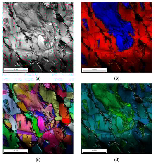 EBSD analysis of the sample after wear test: general view (a), phase detection: red—austenite, blue—ferrite (b), inverse polar figures (c), grain misorientation map (d).