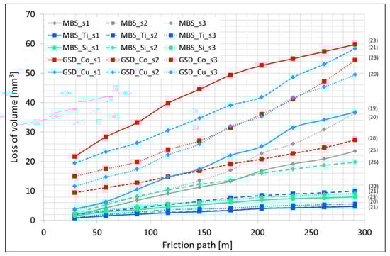 where is the mass loss of individual test pieces per 20 s wear interval [g], is the sliding velocity [m s−1], is the wear surface of the test specimen [cm2], and is the density of the test specimen [g cm−3].