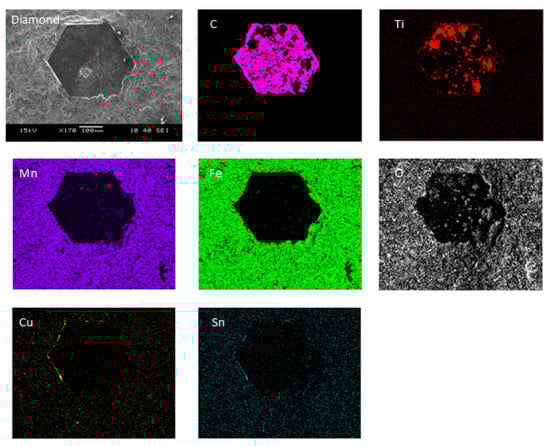 The gathered results showed that specimens containing Ti- and Si-coated diamond particles have the highest abrasion resistance, so it can be assumed that such a combination of materials provides high retention properties. The samples containing Co- and Cu-coated diamond particles were characterized by the lowest abrasive wear resistance. SEM and TEM examination of the Fe-Mn-Cu-Sn-C + DTi samples showed no additional metallurgical bonding between the matrix and Ti-coated diamond. An example of the analysis of composites containing Ti-coated diamond grains is shown in Figure 10 and Figure 11. From Figure 10, it can be seen that Ti still exists on the surface of the diamond, indicating that Ti-coating was not removed during the fabrication of the specimens. It can also be seen that the diamond particle is wetted by the Cu-Sn liquid phase, which further increases the retention due to the adhesion forces.