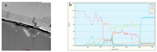 STEM analysis (a) with the results of the linear EDS of the sample containing Ti-coated diamond (b).