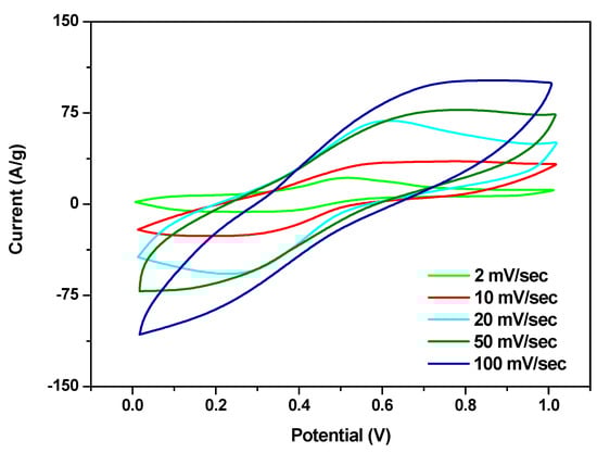 Cycling voltammetry and galvanostatic charge/discharge tests were performed to evaluate the electrochemical properties of the synthesized sample. In Figure 4, the CV curves of FeSe, recorded at different scan rates in a 0.5 M H2SO4 aqueous electrolyte solution, are reported. These curves recorded in the 0–1 V window, although not rectangular, show a near mirror-image current response without highly visible peaks due to the occurrence of surface redox reactions, suggesting good supercapacitor behavior.