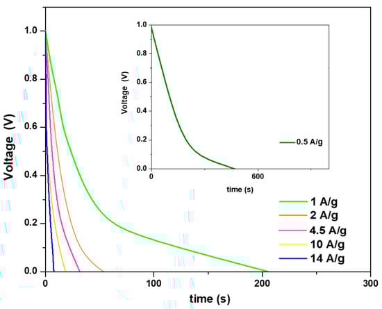 The specific capacitance was evaluated from the galvanostatic discharge curves (see Figure 6) by means of Equation (1). In particular, from the discharge curve, at a current density of 0.5 A/g, a specific capacitance of 280 F/g was obtained. The specific capacitance, as expected, decreased at increasing current densities to 185 F/g at 1 A/g and to 72 F/g at 14 A/g. Indeed, the higher the current density, the shorter the time for the electrolyte ions to diffuse into the electrode channels and, therefore, the smaller the portion of the active material’s surface area they can access. This results in decreased capacitances. In detail, a reduction in the capacitance of about 30% was obtained by doubling the charge/discharge current density.