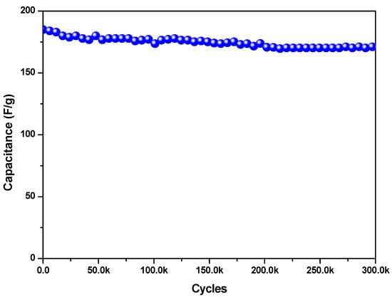 The energy and power densities were also calculated using Equations (2) and (3) and are represented in the Ragone plot in Figure 7. The material showed an energy density of 48 Wh/kg, which decreased to 17 Wh/kg as the galvanostatic charge/discharge current density increased from 0.5 A/g to 18 A/g, while the power density increased from 470 W/Kg to 7300 W/Kg in the same current density range, confirming the excellent performance of the low-cost and environmentally friendly FeSe small-particle material. Furthermore, the electrode retained about 92% of its initial capacitance after 30,000 cycles (Figure 8), indicating a long cycle life with rather high stability.