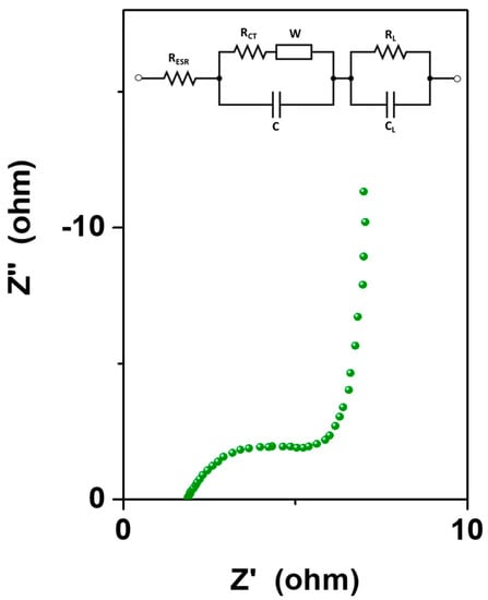 Furthermore, electrochemical impedance spectroscopy was performed to determine the resistivity as well as the charge-transfer and ion diffusion behavior of the prepared material. Figure 9 reports the Nyquist plot of the sample, with the corresponding electrical equivalent circuit, showing an inclined line in the low-frequency region and a quasi-semicircle in the high-frequency region. The arc describes the charge transfer resistance at the electrode/electrolyte interface (RCT) and the interfacial capacitance (C) connected in parallel at the electrode/electrolyte interface, while the inclined portion of the curve (about 45°) in the lower-frequency region is ascribed to the Warburg impedance (W), which refers to the resistance to the ion diffusion/transport from the electrolyte to the electrode surface [36]. At very low frequencies, an ideally polarizable capacitance (CL) would give rise to a straight line parallel to the y axis. However, in this case, the curve is slightly inclined, suggesting the presence of a low-frequency leakage resistance (RL) in parallel with the capacitance. In the high-frequency region, the intercept on the Z′ axis represents the equivalent series resistance, which refers to the combination of the internal resistance of the electrode and the ohmic resistance of the electrolyte as well as the contact resistance between the current collector and the electrode. The sample exhibited an RESR equal to ~2 Ω, indicative of a rather low internal resistance.