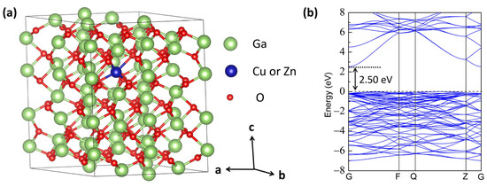 However, no further theoretical reports are available for Cu-/Zn-doped α-Ga2O3, to the best of our knowledge. Thus, systematic research studies on the electronic properties of Cu-/Zn-doped α-Ga2O3 are highly demanded. Research interests in the doping-dependent optical properties of α-Ga2O3 have been addressed recently. The systematic studies of 3d–5d transition metal doped α-Ga2O3 suggested that the induction of IB and IIB transition metal dopants can be endowed with low formation energies and could result in the optical absorption migration from deep ultraviolet to infrared [12]. Pan et al. denoted that added Cu, Ag, and Au elements in α-Ga2O3 led to the transformation from the ultraviolet to the visible light region [37].