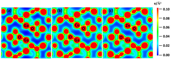 The electron density distribution for (a) perfect α-Ga2O3, (b) Cu-dope α-Ga2O3, and (c) Zn-doped α-Ga2O3. The red and blue colors represent higher and lower electron density, respectively.