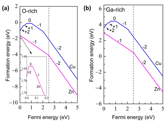 To further study the structural stability of the Cu- and Zn-doped α-Ga2O3 supercell, the defect formation energies under different conditions are calculated, as shown in Figure 3. Meanwhile, in order to assess the ionization energies and effectiveness of doping in α-Ga2O3 systems, we employ the transition levels. The formation energies of Cu- and Zn-doped α-Ga2O3 under an O-rich atmosphere are shown in Figure 3a, and the dashed line represents the calculated band gap of α-Ga2O3. Our calculated value of band gap for perfect α-Ga2O3 is 2.50 eV. We note that the characteristics of band orbital states are consistent with those obtained from previous studies, but the band gap value is smaller than the experimental value, as shown in Figure 1b and Figure 4a [45,49]. The underestimated band gap for DFT calculation is common, but it has no effect on our conclusions qualitatively [50,51].