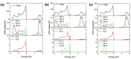 In order to explore the orbital contribution of impurity atoms, the calculated total density of states (TDOS) and partial density of states (PDOS) for perfect, Cu-, and Zn-doped α-Ga2O3 are shown in Figure 4. Figure 4a illustrates that the VBM of perfect α-Ga2O3 is predominantly composed of O 2p orbital-derived states with minor hybridization with Ga 3d and 4p orbitals, while the CBM is composed mainly of Ga 4s orbitals [49]. Additionally, the strong coupling of atomic orbital interaction between Ga and O atoms implies that Ga-O bonds have a covalent bond feature, which is in accordance with the results of electron density distribution.