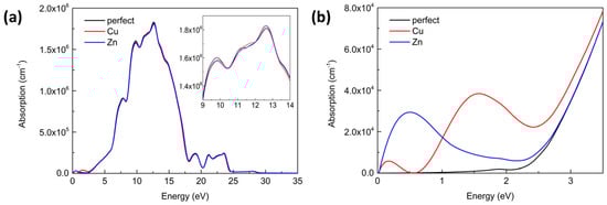 The optical absorption of perfect, Cu-doped, and Zn-doped α-Ga2O3 in energy change from (a) 0 to 30 eV and (b) 0 to 5 eV.