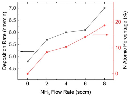 Figure 1 shows that the deposition rate slightly increased with increasing NH3 flow rate in the experiments with varying NH3 flow rates. The flow rates of SiH4 and CH4 were selected to match those used in previous studies on SiC film formation. The resulting deposition rate of the SiCN film is on the scale of nanometers per minute, which enables fine control over the film thickness for thin film applications. In comparison, the established methods for SiC and SiN coatings for dental implants are typically in the range of 200–500 nm [,,,]. By depositing a SiCN film with a similar thickness using this process, it is feasible to achieve a high-quality film in a reasonable time frame.