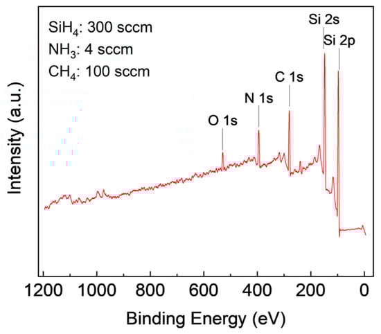 In this study, a plasma-enhanced chemical vapor deposition system (PECVD SLR Series, Plasma-Therm, Saint Petersburg, FL, USA) was used to deposit SiCN onto silicon substrates. The system consisted of a parallel plate configuration, gas shower head, and load lock. NH3, CH4, and SiH4 were used as gas precursors for SiCN deposition. The deposition temperature was set to 350 °C, and three sets of experiments were performed with varying gas flow rates for each gas species. The radio frequency (RF) power was set to 50 W and operated at a frequency of 13.56 MHz. The chamber pressure was set to 900 mTorr.