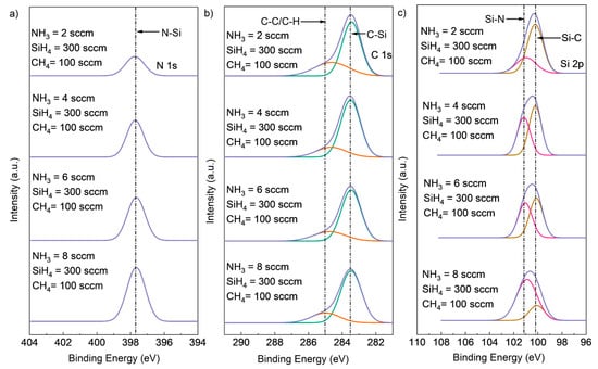 Deconvoluted high-resolution XPS spectra of (a) Si2p, (b) C1s (deconvoluted into two peaks, C-Si (green peak), C-C or C-H (red peak)), and (c) N1s core-level peaks (deconvoluted into two peaks, Si-N (red peak) and Si-C (brown peak)) for SiCN deposited with different NH3 flow rates.