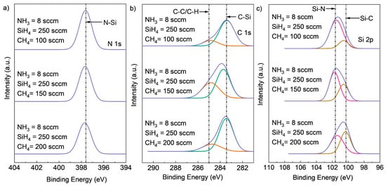 Deconvoluted high-resolution XPS spectra of (a) Si2p, (b) C1s (deconvoluted into two peaks, C-Si (green peak), C-C or C-H (red peak)), and (c) N1s core-level peaks (deconvoluted into two peaks, Si-N (red peak) and Si-C (brown peak)) for SiCN deposited with different CH4 flow rates.