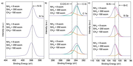 Deconvoluted high-resolution XPS spectra of (a) Si2p, (b) C1s (deconvoluted into two peaks, C-Si (green peak), C-C or C-H (red peak)), and (c) N1s core-level peaks (deconvoluted into two peaks, Si-N (red peak) and Si-C (brown peak)) for SiCN deposited with different SiH4 flow rates.